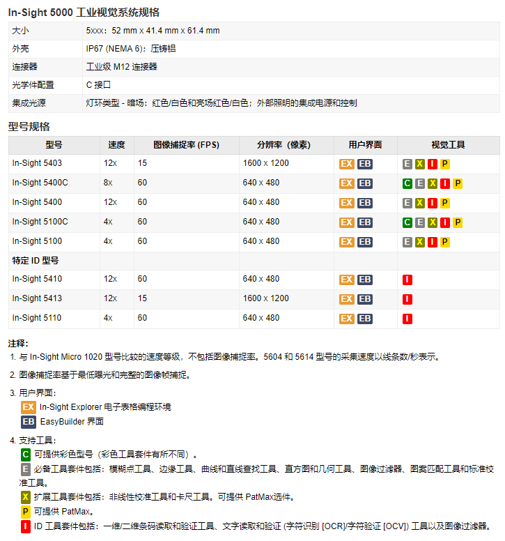 每种 In-Sight 5000 视觉系统型号都能提供更好的性能。。。大部分型号都通过简单易用的 In-Sight Explorer 软件配备完整、、成熟的康耐视视觉工具库。。。